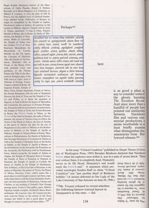 Mark Z. Danielewski’s House of Leaves (2000) provides further inspiration for writers seeking to engage with their readers by means of layout. The book – whose multilayered narrative revolves around Johnny Truant’s discovery of Zampanó’s The Navidson Record – must occasionally be rotated to be read (see figure 2) while some pages only have a few words or lines, thereby reflecting the book’s storyline. Other techniques used by the writer include appendices, footnotes, several font colours and typefaces and mirror writing (see figure 2).