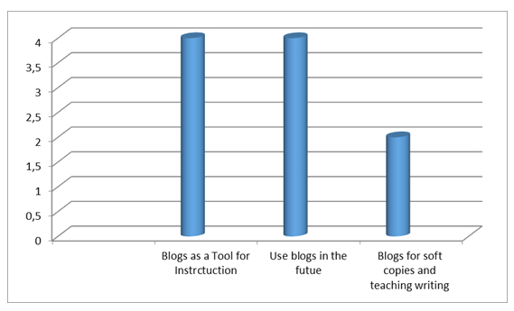The four teachers who participated in this research study clearly see blogs as tools to accomplish various instructional goals. They argued that the students’ skills were reinforced while blogs allowed for differentiation of instruction. Blogs encouraged cooperative team planning, helped foster learning focused conversations, and resulted in higher self-esteem for the student participants. The four teachers reported a desire to use blogs for many learning projects in their future teaching. Still, two stated that they have to plan far ahead. They explained that have formulated ideas for classroom blog use that will guide them in their future instructional planning. The four teachers  stated that they will send soft copies for material covered in class that serves as a record for all students and to help absent students catch up. Class Blogs will include extra resources, links to helpful sites.  Two teachers  also said that will try blogs in teaching writing.