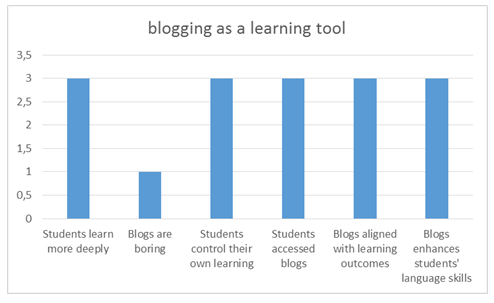 The two teachers who introduced students to constructing blogs also liked the experience. Students who have smart phones created their own blogs on the spot and taught other interested students how to create theirs. Student began writing, reflecting and sending links to helpful materials on their blogs. They sent the links to their new entries to the teachers’ e-mails and to their colleagues on the groups Facebook groups.  Students were active in the first seven weeks but they were not that active in the following seven weeks.