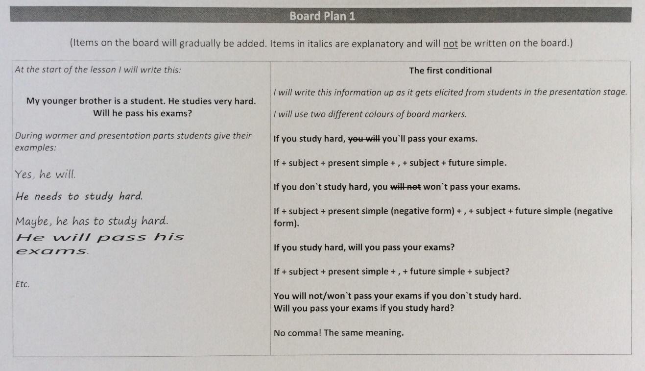 Teachers sometimes forget or miscalculate the space needed for an explanation of a certain concept, for example, the timeline for events mentioned in the first conditional sentence. In that regard, a board plan is arguably the best reminder, template, and sample for a grammar lesson. This plan might be of great use when some games are planned after the explanation part of a lesson. When a teacher makes their board plan for a lesson, they will feel more confident, save time during the lesson, and offer well-tested sentences when a grammar concept has to be explained.