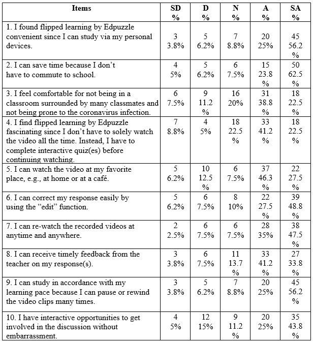 As shown in Table 4.1, most students expressed positive attitudes towards flipped learning through Edpuzzle with higher percentages of agreement (A) and strong agreement (SA). Generally, the responses showed that most students rank the benefits of applying this teaching tool in flipped learning 4 and 5 on a 5-point Likert scale. Specifically, 86.3% was the highest proportion of participants expressing their agreement or strong agreement on the help of flipped learning through Edpuzzle in saving time to school. 82.5% of the participants agreed or strongly agreed that learning through Edpuzzle gave them flexibility because they could re-watch the recorded lectures at anytime and anywhere. 81.2% could keep track with the lesson at their own learning pace since they found it easier to rewind or pause at the difficult part, while 81.2% also confirmed the convenience of flipped learning with a variety of learning aids, e.g., a laptop or even a cell phone. As far as the benefits of personalized learning opportunities, more than half of the samples, i.e., 76.3%, were stress-free from a fear of losing their face or shyness in participation.