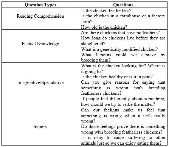 Questions on The Featherless Chicken from 8 graders in one mid-tier Singaporean public high school P4C session using the Connecting Hearts and Minds Framework