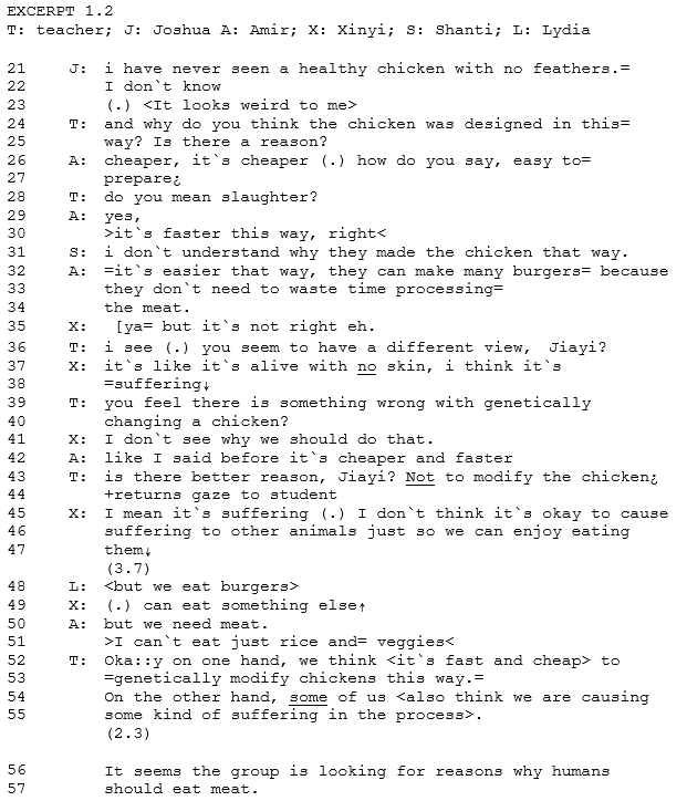 At line 35, X remarks overlaps with A, to which the teacher formulated a clarification request (i see (.) you seem to have a different view, Jiayi?). X responded with an emphasis on the word “no” in line 37 to substantiate her view. Noticing the sympathetic response, the teacher elicits the position underlying the emotion in her pragmatic turn (something wrong, line 39) and reformulated the L2 output (genetically changing a chicken). Here, the teacher had introduced a more academic word choice. As the group delves further into the communicative act, the teacher used a subsequent elicitation strategy with a direct prompt in line 43 to elicit further substantiation by lightly stressing on the adverb, “Not”. The teacher curiosity was observed in her slightly rising intonation and her refrain from making repairs to syntactical structures (line 49, can eat something else). Following X`s emphatic response, the group enters into silence. Thereafter, more spontaneous production ensues among the students indicating some cognitive dissonance had arisen in the prior interaction. The teacher subsequently synthesized the development of the discussion using slower speech for added clarity and posed a follow-up question that places a higher cognitive demand for an ensuing discussion.