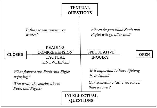 In the visual text example of Pooh and Piglet`s conversation in Figure 1, teachers can indicate to students the different types of questions that can be elicited from such a visual text. One way to achieve this is through the use of a Question Quadrant (Cam, 2006). The Question Quadrant is divided into four sections (see Figure 2). Reading comprehension and factual knowledge questions are questions that provide a one-off response which do not require much expansion. These are commonly known as closed questions. On the other end of the totem pole are open-ended questions where responders can provide a myriad of answers which can be further expanded. Teachers can help learners distinguish between various questions they would like their students to ask more in their classrooms—particularly, inquiry-based questions. Inquiry-based questions are generally intriguing in that they invite the reader or listener to make real-life connections with what they already know about their life-worlds and what they have yet to know about the world. There are no definitive answers. Students do not ask these sorts of questions often enough and teachers can encourage them to do so as inquiry is a habit of mind that requires adequate support and practice.
