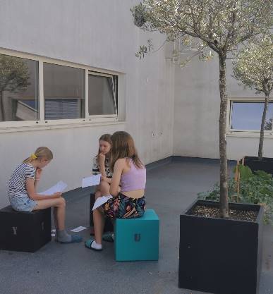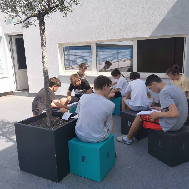 Students worked at different speeds. Having the possibility of having additional classroom outside of school which is just across the hall, those students who had already completed the text went outside and started the process of sharing their texts with their classmates. Later on, when they had finished, they could support other classmates, who needed more time to finish their work.