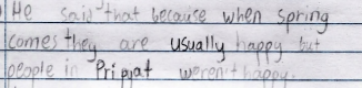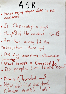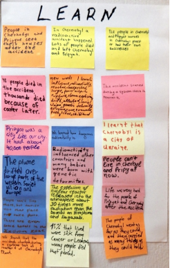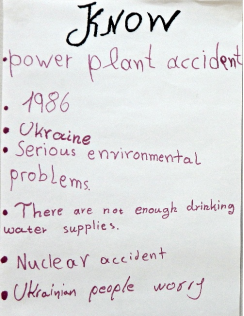 This was a sixth-grade group (approximately A2 language level) of eleven-year-old students. They were not even born when the Chernobyl accident happened, yet these two sentences provoked a series of questions on the what, why and how of the event.