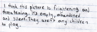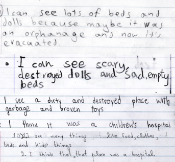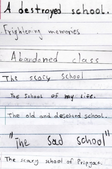 Then, a series of images (nine in total) was used to encourage more emotional, empathetic and creative understanding of the Chernobyl accident. After showing each image there was a question students had to respond to, individually or in pairs. A time limit of a few minutes was set. The visuals invited students to reflect on different aspects of the Chernobyl accident and its impact on the lives of the inhabitants.