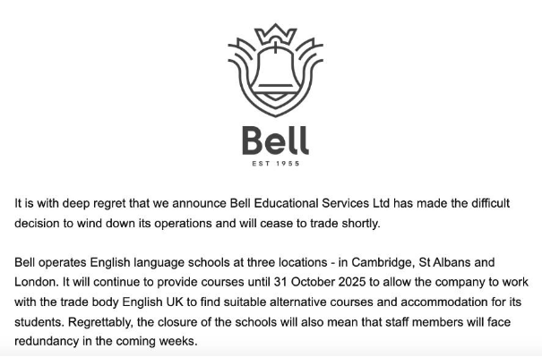 Bell English, the UK-based English language school chain, closed its three London, Cambridge, and St Albans locations on October 31, 2025, due to financial difficulties, including cashflow challenges and the lingering impact of the COVID-19 pandemic. Despite attempts to find a buyer, the schools ceased operations, leading to redundancies for staff and requiring students to find alternative courses. The Swiss branch of Bell remains open and operates independently. Reasons for closure many like cashflow issues, covid impact and inability to find a buyer. Also, Brexit and the fact that the UK is no longer in the Erasmus+ project must have been a nail to the coffin as well.