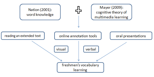 Reading an extended text, checking vocabulary via online annotation tools compatible with online dictionary, and giving oral presentation can provide both visual and verbal forms of vocabulary learning in order to help freshmen acquire word knowledge in word form, meaning, and use from sensory memory, working memory, and then into long-term memory. In order to effectively use the new framework for EFL learners’ vocabulary acquisition, two major issues should be taken into consideration in terms of complete word knowledge as rich input, and learners’ demonstration of word knowledge.