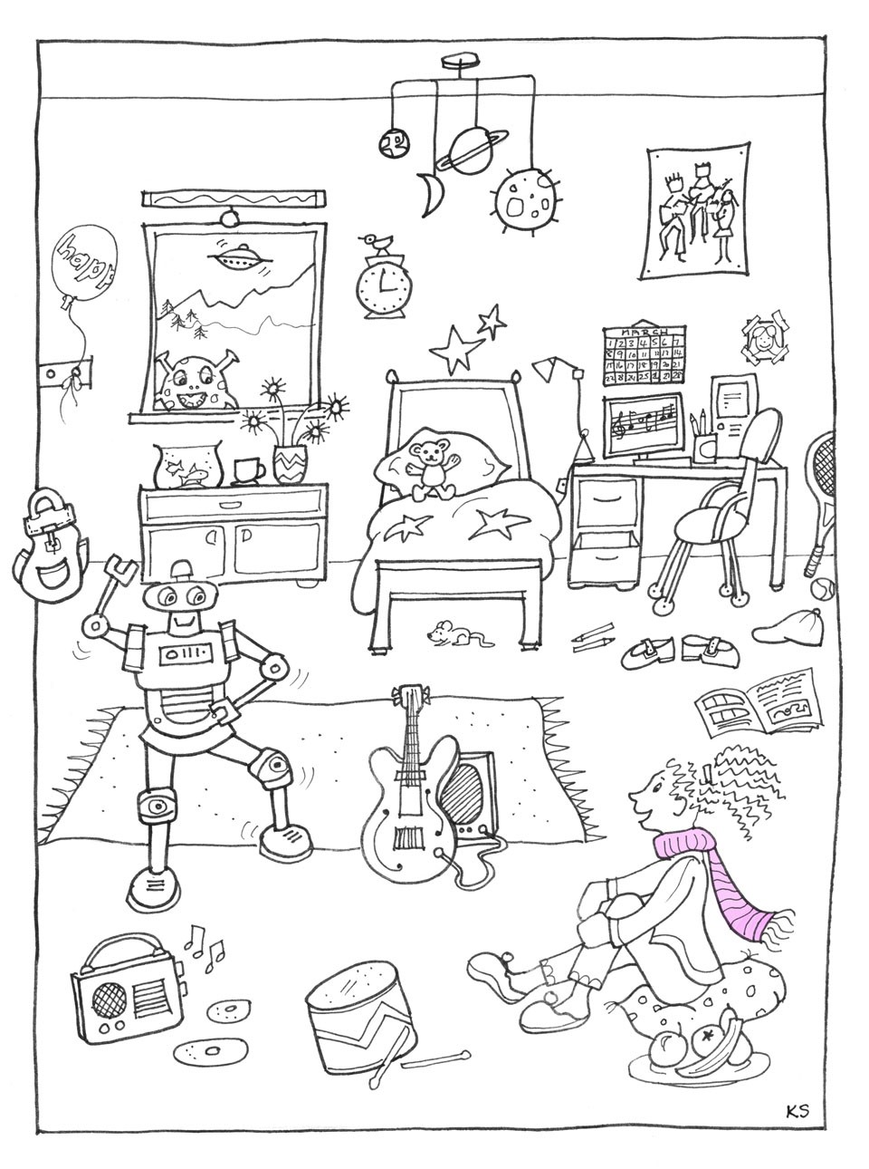- Give colouring instructions for e.g. the stars on the bed, the bigger fish, the pencils on the floor, the CD that’s in front of, not next to, the radio, the hand that’s above the robot’s head, not below it. If time allows, let learners colour other parts of the picture with their own choice of colours, too. Ask different learners to tell the rest of the class about one thing they coloured, which colour they chose and perhaps why.