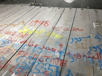 In the evening near our hostel we find some guys making a polystyrene model section of Israel’s wall across Palestine, complete with graffiti, which they will put across the marathon route. This means that the leading runners will have to break through the polystyrene wall, and since runners are from all over the world, that means that it will be the international community that symbolically breaks through the wall…