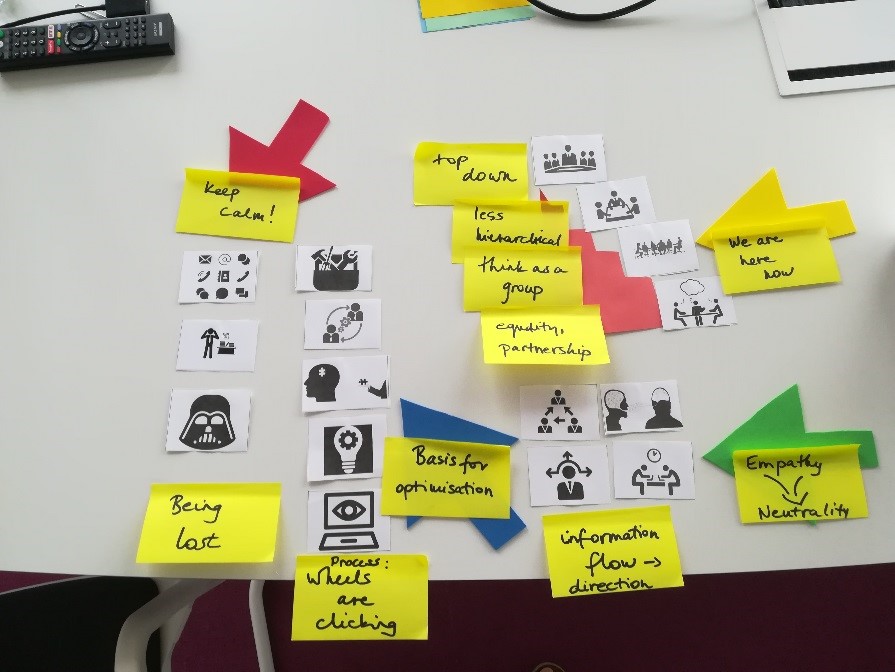 Out-of-the-box thinking will trigger unthought of solutions and a mindset shift for clients finding it difficult to find firm ground under their feet in the target language. After all - particularly in a corporate environment - clients have grown accustomed to coaching that supports their goals in a business context, therefore the process itself will be familiar. This sort of activity below zeroes in on creativity and fun, yet addresses complex notions concerning the communication taking place in workplaces. Take a look, it is a visual interpretation of one manager’s communication with the help of icons, post-its and arrows. I definitely couldn’t have come up with these ideas. The activity enriched an ongoing discussion we were having about what aspects of the manager’s communication needed attention.