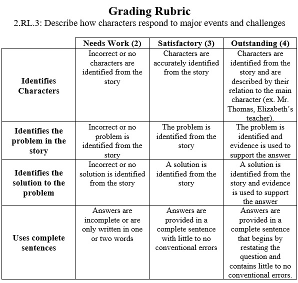 Through this study, data have been collected and analyzed to answer the following question: when compared with generalized, whole-group instruction, how does small-group reading instruction impact second grade students in meeting required state standards in a mixed-ability classroom? To answer this question, I have explored various ways reading instruction can be administered with an overall goal of assuring all students at all reading levels master the goals outlined in Ohio’s Second Grade Common Core State Standards (CCSS). Participants in this study are mastering Ohio’s Second Grade CCSS 2.RL.3: Describe how characters in a story respond to major events and challenges. This is a reading comprehension skill that students in second grade are expected to master in order to develop their reading abilities and deepen their understanding of the texts they read. In this study, students answered questions about who the characters in a story are, what challenges they face, and how they overcome their challenges. A copy of the graphic organizer used to analyze all texts in this study can be found in Appendix A.
