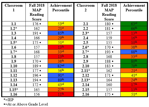 Across both classrooms, students in this study started this school year struggling with their reading and reading comprehension. The results from the Fall Reading MAP test students took at the start of the school year showed that only 56% of students in Classroom 1 and 50% of students from Classroom 2 were reading at or above grade level (Appendix C). While this is not the only tool used to measure student achievement, MAP Scores do play a very large role in both students’ projected success on the 3rd Grade Reading Guarantee State Assessment they will take next year, and teacher yearly evaluations of effectiveness. Based upon the overall scores observed in these classes, it is clear that implementation of a rigorous instructional practice is essential to help these struggling readers become successful and return to an ‘on-track’ status for future reading assessments.