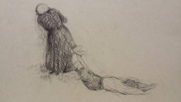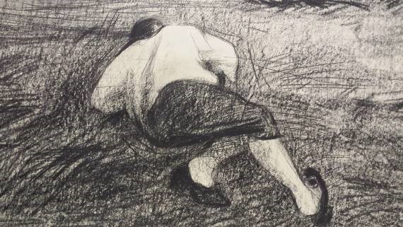 This man has dropped to the ground, twisted with the pain of the spreading tumours. His legs are, anatomically, just beyond the feasible but I wanted to express the torture he was in.