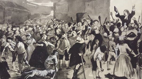 ….the possessed rabble impelled Wesley up and down the streets, and across the river, shouting “Knock his brains out! Down with him! Kill him at once! Drown him! Hang him on the next tree!” and even “Crucify him!” Somehow he survived with no further damage than a flap of his waistcoat being torn off, mercifully not the one with papers and money in it. When he tried to slip in to the door of a house that he saw stand open, they dragged him out by the hair. He was hit twice, but both blows were as nothing, “for though one man struck me on the breast with all his might, and the other on the mouth with such a force that the blood gushed out immediately, I felt no more pain from either of the blows than if they had touched me with a straw.” Going down a slippery hill, many tried to push him over, but he knew that if he fell he would never get up again, so he did not even stumble. Angels, Charles recorded, held him up. A lusty man behind him struck at him several times with an oak cudgel, a knock from which would have meant death, but every time the blow was turned aside; how, Wesley did not know. Another man came rushing at him through the press, and raising his arm to strike, suddenly let it drop gently, and stroked Wesley’s head, saying: “What soft hair he has!” The scene is typical of many which went on through years, down to the final act of the magistrates who had refused to see Wesley: they issued a warrant for his arrest on the charge of raising routs and riots!