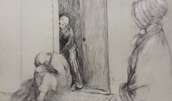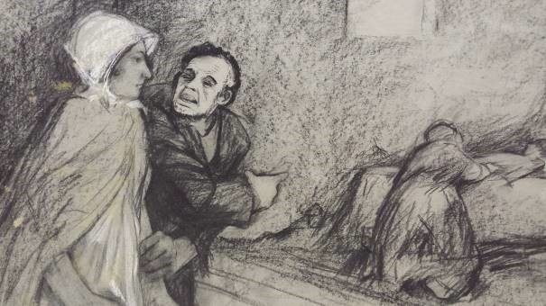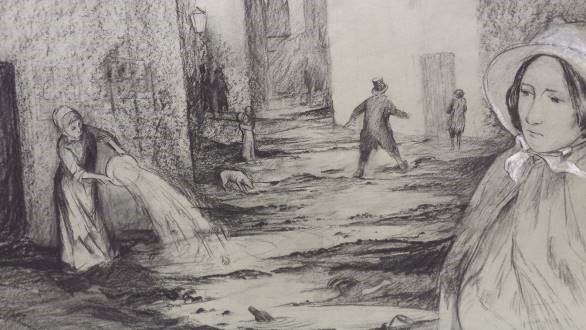 This picture is designed to introduce the idea of Mrs Gaskell going in to the city and seeing at first hand the deprivation of the people living there. I designed it so that the camera would zoom in to Mrs Gaskell’s face then pan left to the woman throwing her slops into the undrained street. Dogs and children in this muddy, stinking environment.