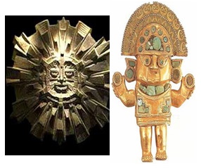 Apu-punchau was believed to be the ancestor of the Incas. He was at the head of the state cult, and his worship was imposed throughout the Inca empire. He was usually represented in human form, his face portrayed as a gold disk from which rays and flames extended. His sister and consort was the moon, Mama-Kilya (or Mama-Quilla), who was portrayed as a silver disk with human features. Among the 20th-century Quechua people, he is occasionally confused with Christ or God. |