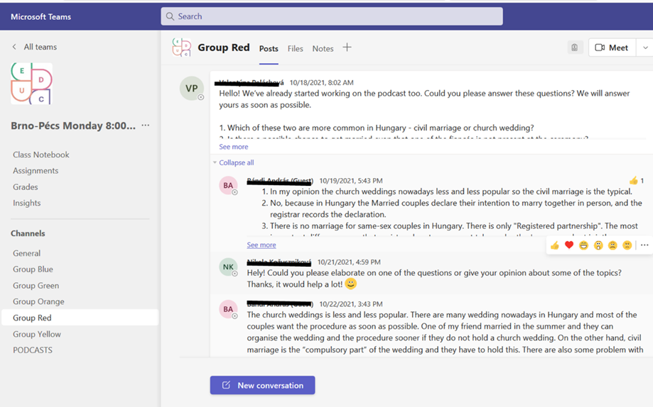 Since one of the aims of the project was to promote learner autonomy, it was left to the groups of Czech and Hungarian students to decide how they would interview their colleagues. Most of them used the space provided in MS Teams for online meetings and chat exchanges or for online documents where they asked and answered their questions, but some teams used alternative platforms like Facebook or Messenger.