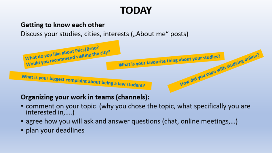 The second part of the kick-off meeting was reserved for individual interaction of the working groups. The paired Czech/Hungarian teams were assigned a pre-prepared channel in MS Teams. They were given time first to get to know each other and after that to plan their cooperation and strategy for obtaining the information needed for their respective podcasts. The team members introduced the legal issues/topics they had chosen, explained what would be needed from their counterparts, and agreed on how they would exchange information. Last but not least, they were asked to agree on their own internal deadlines.