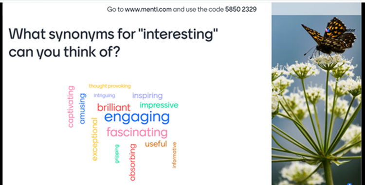 Peer feedback was considered a very important element of the whole experience. Students were therefore given detailed instructions and sufficient support for providing it. A series of e-learning tasks focusing on the respective language, strategies, tips and examples were designed for them. An activity worth mentioning here was one that trained students to use meaningful adjectives to express their opinions on the reviewed podcasts. In class, we explained that the phrase “your podcast was interesting” was forbidden, due to the dual meaning of the phrase and the general vagueness that it conveys. Students were asked to brainstorm as many synonyms of “interesting” as possible. Involving all students using the interactive tool Mentimeter made the activity even more… captivating, amusing, engaging, gripping.