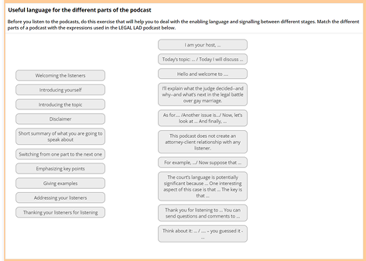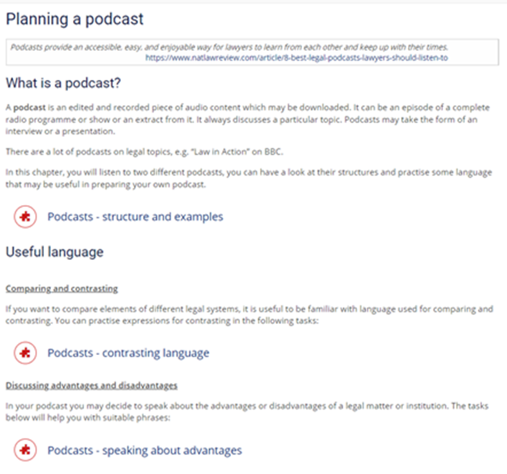 How does one go about creating a podcast? Adequate preparation and careful scaffolding are crucial to foster student success in any endeavour, and podcast creation is no exception. The teachers therefore designed e-learning support consisting of activities on podcast structure, examples, tips for a good podcast, and useful language (e.g., for speaking about legislation, mediating information, signalling, comparing and contrasting).