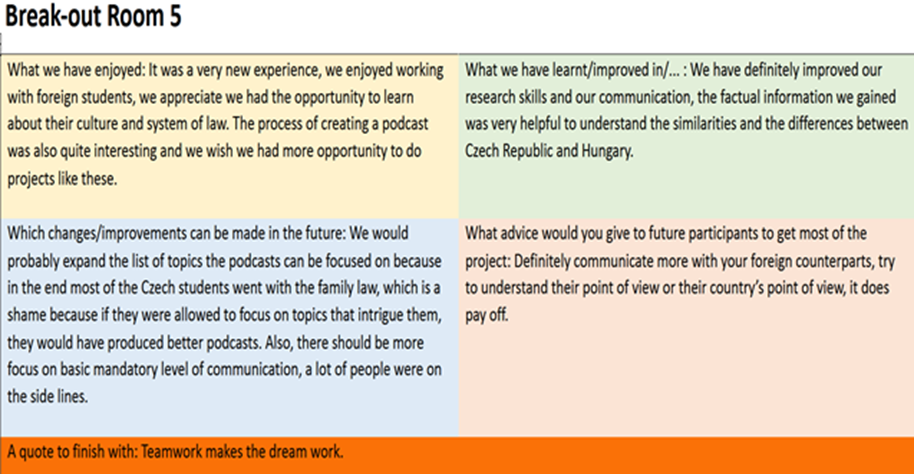Students enjoyed that the whole experience was something new and fresh. Some found the process of creating and recording a podcast “worthful and amazing”, ad many said it was truly enjoyable. Others observed the tasks had been challenging but attractive. Students were happy that they made new friends and cooperated with lawyers-to-be from abroad, and they appreciated the opportunity to get to know another culture and its legal system. They liked that they expanded their knowledge of the law and the other country, had to communicate in English, and had a lot of writing and speaking practice.