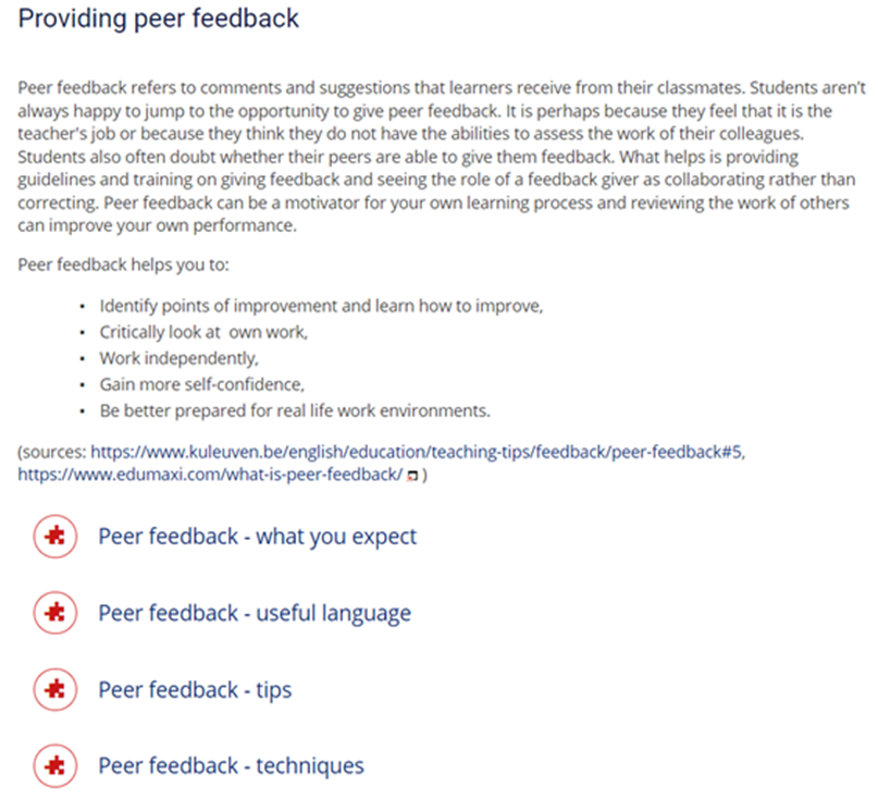 After all the teams had published their podcasts on an MS Teams podcast channel, the students were asked to listen individually to three podcasts produced by other groups (one Czech, one Hungarian, and one of their own choice) and subsequently to provide feedback on them. To ensure that every podcast would receive feedback, it was compulsory for the students to listen to the podcast of the paired foreign team from their MS Teams channel.