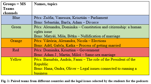 Students were given the following instructions: prepare and record a podcast of 10–15 minutes comparing and contrasting the Czech and Hungarian legal systems in relation to a specific legal issue. Include information you have obtained from your colleagues from the other country. All team members must be equally involved.
