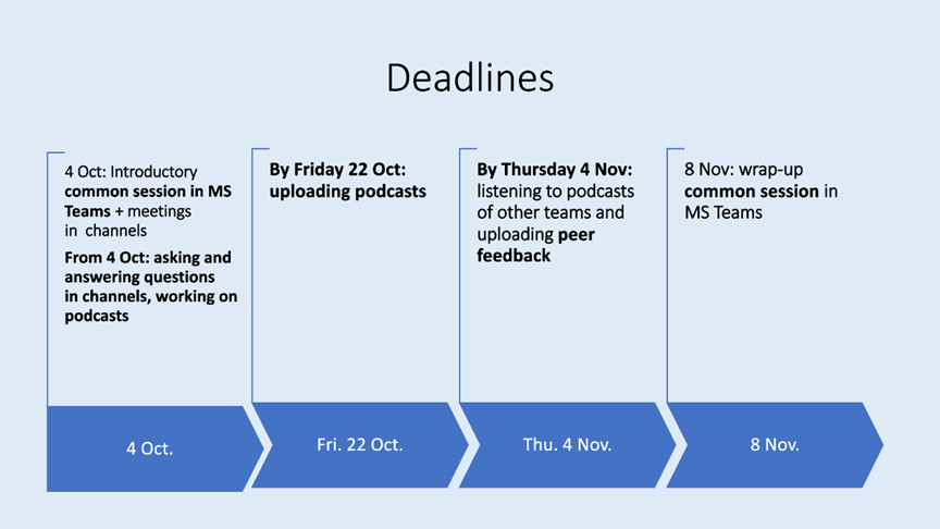 The students were shown a format used by professional podcasters illustrated by model examples from the area of law (e.g., https://www.quickanddirtytips.com/ and https://studylegalenglish.com/). They were encouraged to make a professional sounding podcast including a jingle, disclaimer, and other features, though these were not obligatory. As for the technical side, the teams were free to use any platform or software.