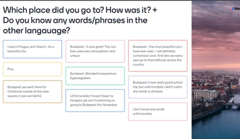 The first direct contact between the participants happened in what we chose to call a kick-off meeting. It took place in a shared lesson led together by a Czech and a Hungarian teacher. An icebreaker focusing on students’ experiences with the other culture (Czech/Hungarian) was conducted with the whole class (see Fig. 3). Students were then provided with more details about the project, its aims, description of tasks, and deadlines (see Fig 4). This clarity of instruction was believed to be essential for the success of the undertaking.