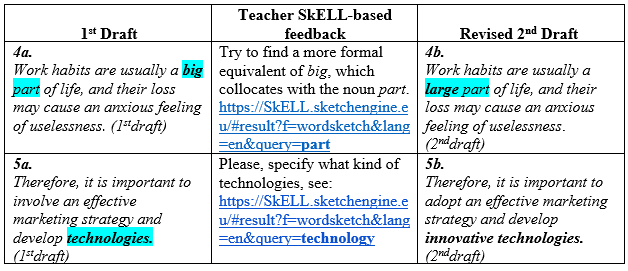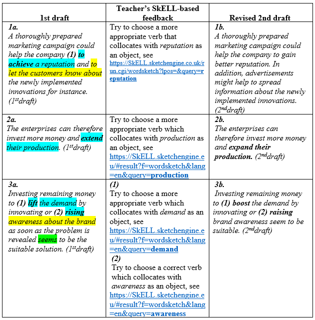 Corpus information can be added to indirect feedback using SkELL to offer students help with finding the correct or appropriate collocation or a more formal expression or with checking how a given word or phrase behaves in English. In doing so, teachers indicate an inappropriate collocation or misused expression in a student’s text and hyperlink it to SkELL together with instructions specifying which search term to focus on. This corpus-based indirect feedback makes learners consult corpora themselves and may assist in improving their use of collocations in a subsequent draft. Table 1 illustrates examples of corpus-based feedback on noun–verb collocations with the revisions writers undertook in the subsequent versions of their texts.