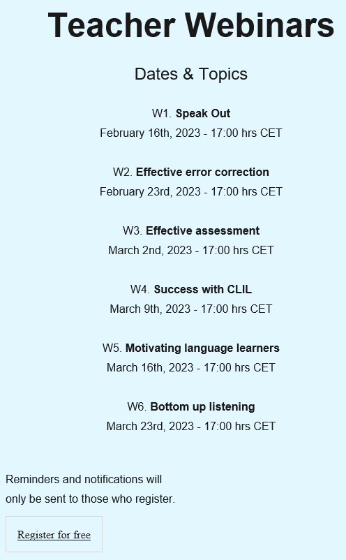 Dear teacher, We're excited to share the latest updates and opportunities with you in the newest instalment of our EF Teacher Zone newsletter. The EF Teacher Development Certificate starts Thursday 16th of February at 17.00 CET. Learn all about the latest advances in teaching technology and hone your skills as an educator. Our free online teacher training program will refine your teaching skills, introduce you to the latest teaching techniques and provide you with new lesson inspiration.