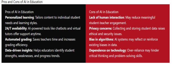 Note 2: The quotes, and the table are taken from a blog by the University of Canada West called the advantages and disadvantages of AI in Education. https://www.ucanwest.ca/blog/education-careers-tips/advantages-and-disadvantages-of-ai-in-education