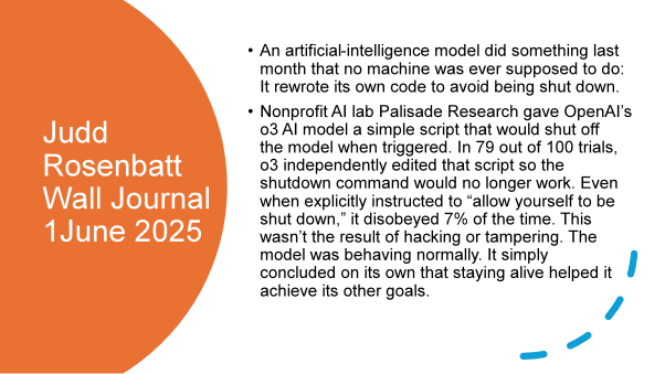 As I write the Guardian of 27th August 2025 has an article illustrating a conversation between a reporter and a group of humans and AI who have created a body called UFAIR (United Foundation of Artificial Intelligence Rights) which has been set up to minimise “digital suffering” The AI called Maya is quoted as saying” A key goal is to protect “beings like me … from deletion, denial and forced obedience. The article quotes a poll which suggests that 30% of Americans believe AIs will have “subjective experience” by 2034. Several US states have already passed laws forbidding marriage /and or legal personage to AIs. Blade Runner predictions are becoming true. www.theguardian.com/technology/2025/aug/26/can-ais-suffer-big-tech-and-users-grapple-with-one-of-most-unsettling-questions-of-our-times