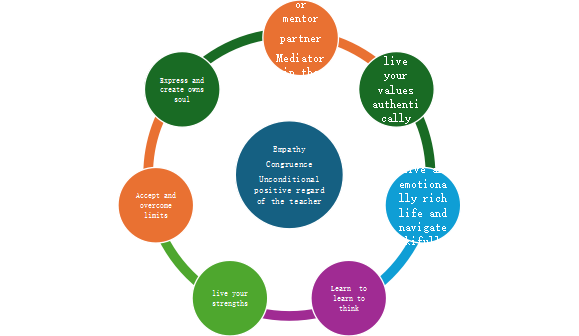 A humanistic education teaches and develops the person so that they can live a fulfilling life. It places at the centre of the wheel the core safety net that hatches potential through the creation of an environment that fosters empathy, congruence between thoughts and behaviour and unconditional positive regard. (Note 13)