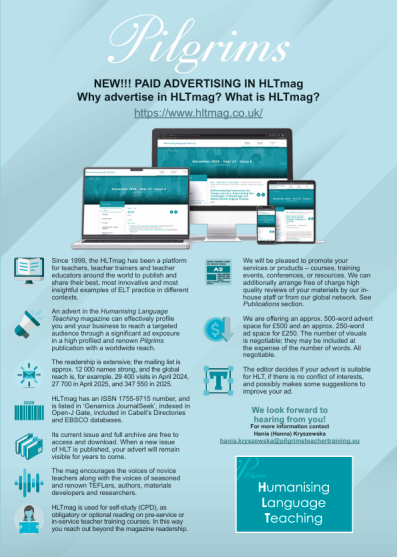 We have new Pilgrims initiatives – like The Pilgrims Teacher Trainer Panel Discussion on: Using AI in the Humanistic Language Classroom, Saturday 21st February 2026, a joint HLT and TTJ Pilgrims conference in October, and online Pilgrims courses we are planning throughout the year.