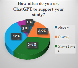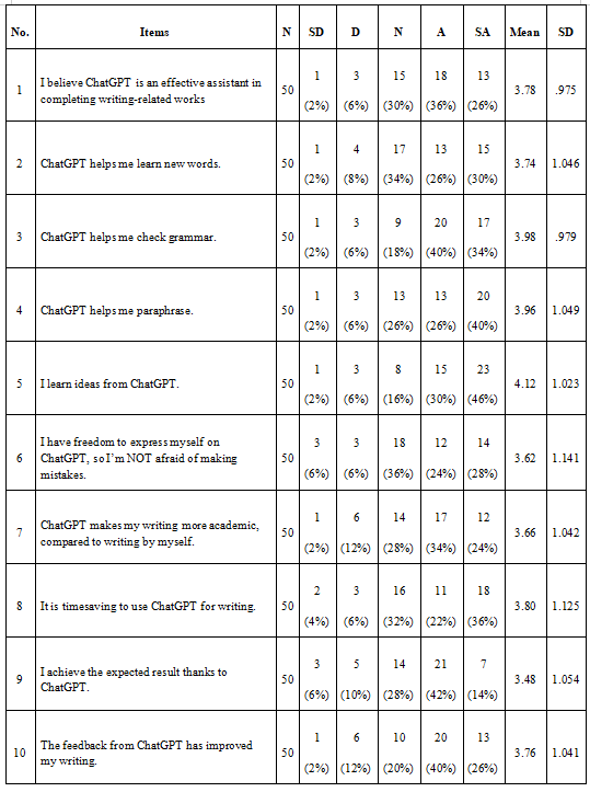 To collect the data, questionnaire and interview were served as research instruments. The researcher used Google Form to design the questionnaire which was divided into four sections. The first section had 3 questions about demographic information such as name and gender. The second section explored the familiarity of the participants with ChatGPT and what they frequently used ChatGPT for. The third section consisted of 10 questions using the five-point Likert scale (1 = Strongly Disagree; 2 = Disagree; 3 = Neither agree nor disagree; 4 = Agree; 5 = Strongly Agree) to study the participants’ perspectives on the effectiveness of ChatGPT towards facilitating their writing ability. Meanwhile, the fourth one referred to their viewpoints on the drawbacks of ChatGPT affecting their writing ability. The interviews were conducted on Microsoft Teams. 10 participants were invited to interview based on their ChatGPT use frequency. Each participant was informed that the interviews were recorded and lasted 5 to 10 minutes. They preferred using Vietnamese to fully describe their experiences, feelings, and opinions towards using ChatGPT as writing assistance. Vietnamese answers were translated into English during the process of data analysis. All responses were considered and categorized carefully to show interview extracts presented with explanations. Below are the two questions during the interview: