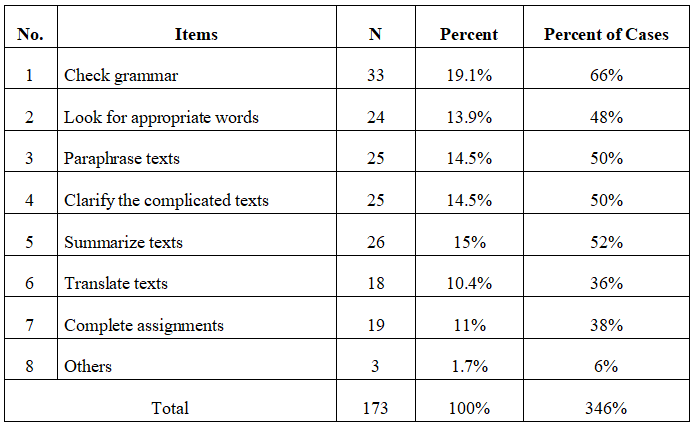 The table revealed that ChatGPT was used for checking grammar, taking up the highest percentage with 66% of the students. 52% of the students used ChatGPT for summary, whereas paraphrasing and clarifying the complicated texts consisted of half of the students (50%). It could be seen from the table that 48% of the students employed ChatGPT to look for suitable vocabulary. There were two other purposes of making use of ChatGPT, such as translation and assignments, with a small gap accounting for 36% and 38% respectively. Only one student searched for information on ChatGPT (2%), which was similar to other goals including content recommendation before presentation, research purposes.