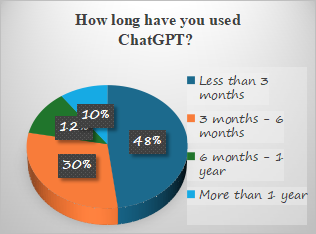 Regarding the duration of taking ChatGPT as writing assistance, the percentage of the students having used ChatGPT for less than 3 months was the highest (48%), while 30% of them had used ChatGPT for 3 to 6 months. According to the data, 12% of the students spent 6 months for 1 year on ChatGPT. Students who contributed more than a year on ChatGPT accounted for a low proportion (10%). Table 4.1 showed the objectives of students toward the use of ChatGPT as follow