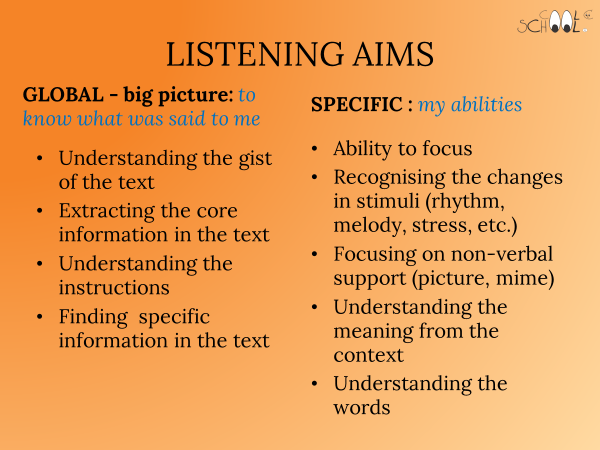Through storytelling, we address strategies of global listening, which is the ability to understand the gist of the content.