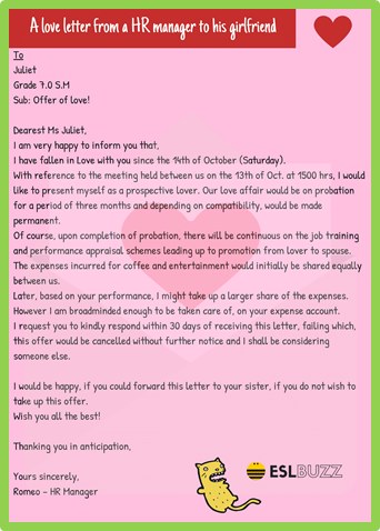 Dearest Ms Juliet, I am very happy to inform you that I have fallen in Love with you since the 14th of October (Saturday). With reference to the meeting held between us on the 13th of Oct. at 1500 hrs, I would like to present myself as prospective lover. Our love affair would be on probation for a period of three months and depending on compatibility, would be made permanent. Of course, upon completion of probation, there will be continuous on the job training and performance appraisal schemes leading up to promotion from lover to spouse. The expenses incurred for coffee and entertainment would initially be shared equally between us. Later, based on your performance, I might take up a larger! share of the expenses. However I am broadminded enough to be taken care of, on your expense account. I request you to kindly respond within 30 days of receiving this letter, failing which, this offer would be cancelled without further notice and I shall be considering someone else. I would be happy, if you could forward this letter to your sister, if you do not wish to take up this offer. Wish you all the best!!!! Thanking you in anticipation, Regards,