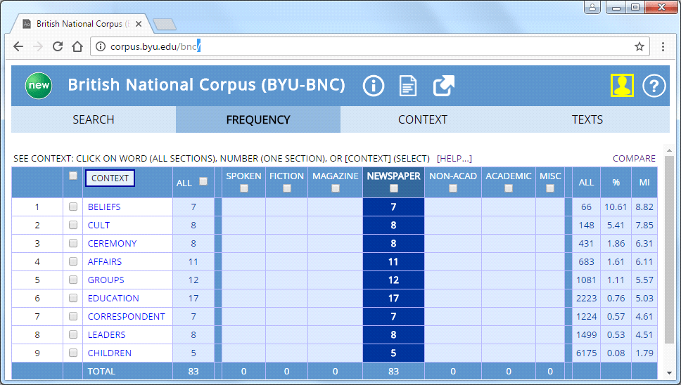 In short, opinion has an influence upon whether Islam is ‘religious’ or ‘spiritual’, whereas it’s a fact that Sufism is the mystical branch of Islam, which means ‘spiritual terror’ would derive from there, while ‘spiritual’ remains an English word influenced by powerful opinion, that is, public opinion could be influenced away from using the collocation ‘spiritual terror’ by Sufism, so emboldening Christianity’s belief that its spiritual power is unshakeable. A basic word search in both the BNC and COCA for collocational patterns with 4 noun words to the left and right within the sub-corpora of newspapers used relevance to sort and determine MI score with a minimum frequency of 5 `hits` as the criteria.