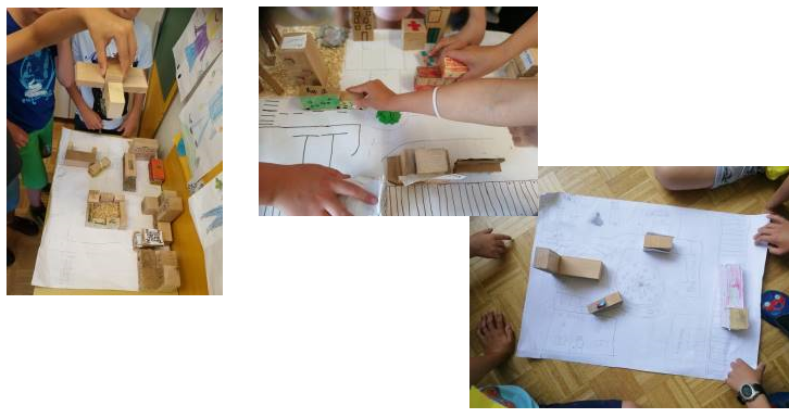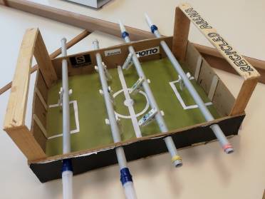 In the fourth grade, we talk about taking care of the environment and how to make toys out of recycled materials. Some pupils choose to create their own toys and wrote about them, as for example making a table football. It's made from a wooden box, plastic tubes, collage paper, a ball, elastics and clothespins.