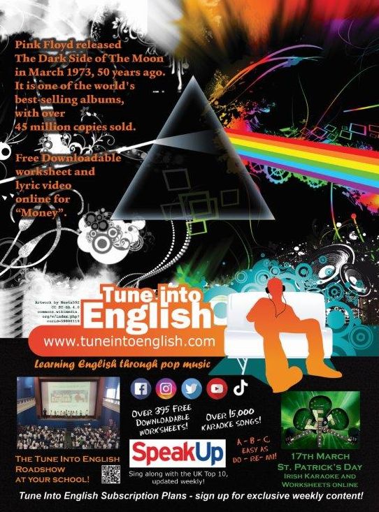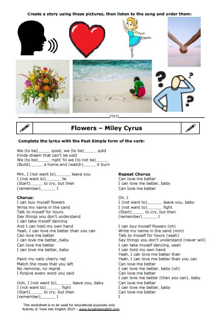 Miley Cyrus has the most popular song so far this year– there is now a free Downloadable worksheet for this on Tune Into English, so why not offer your students some Flowers.
