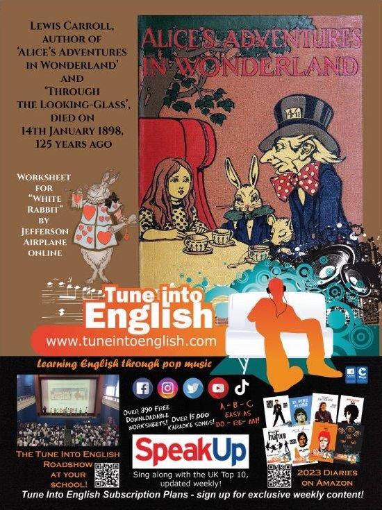 The 14th of January is the 125th anniversary of the death of Lewis Carroll, author of the ‘Alice In Wonderland’ books. This upper level worksheet is based on Jefferson Airplane’s 1967 hit.