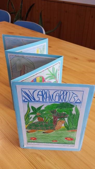 This is a ten page zigzag book. Each white sheet is A5.  It was made by a group of Austrian teenagers following a story making.  Each teenager wrote and illustrated two or three pages.  Most of the work was done in their private time and they did it because they loved doing it.