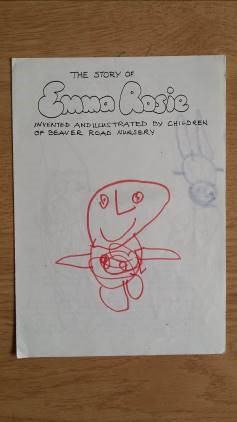 A class of children aged four made this 4 page story about Emma Rosie in their mother tongue.  I went home, typed up their story as you see below, photocopied enough for copies  for each member of the class and explained to them that it was their story and their book.  They illustrated it…matching their illustration with what they believed to be the text on that page.
