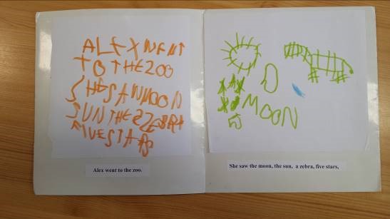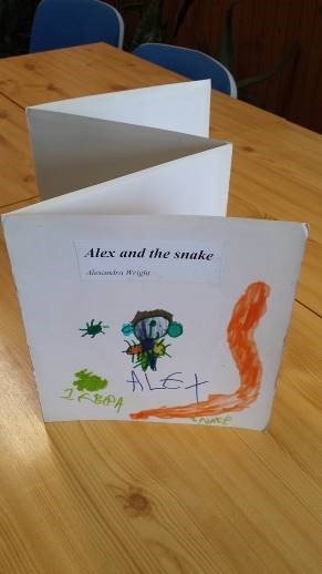 With children who can make a story with me orally but cannot write I write the story for them…type it onto the different pages in the book…then photocopy the book and give it to them to illustrate. In this case with Alex it is a mixture! English is Alex’s second language.