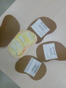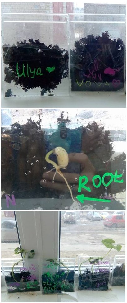 1. We take broad beans and cut them open and check if its inner part corresponds to the seed structure we drew before. Then we plant the beans in transparent CD boxes, so we can watch the growth, tape them and put them on the windowsill.  ( 50 min) As we see the changes, we start labeling the plant.